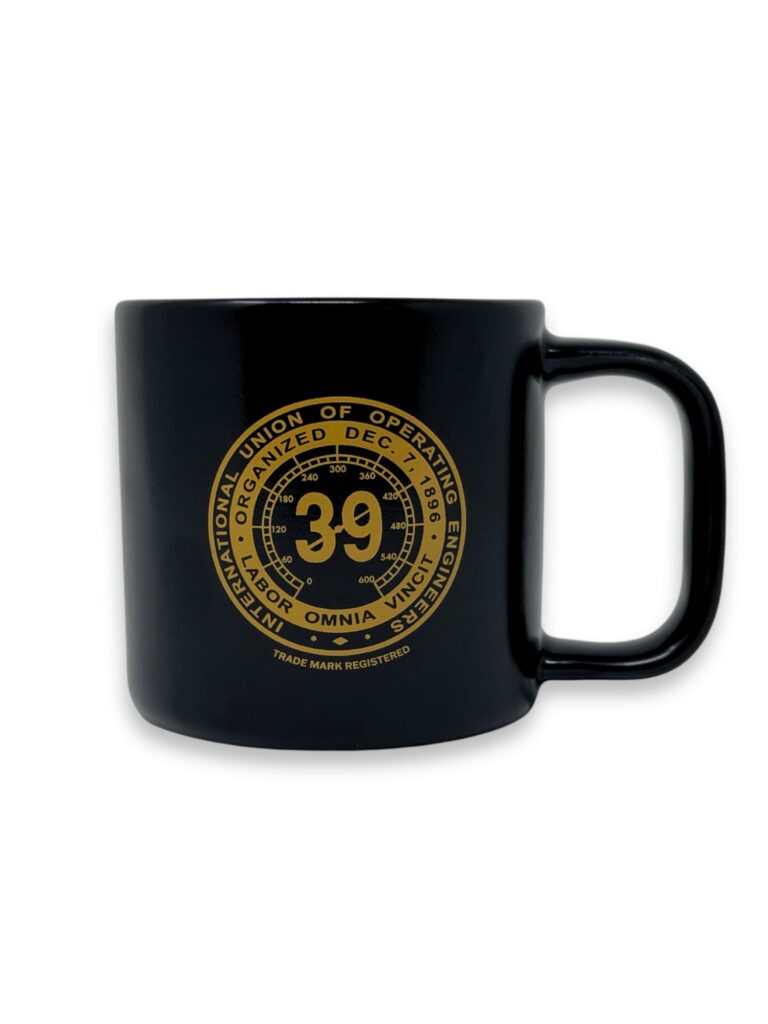 Rustic USA-Made mug. IUOE 39 Old Guard logo.